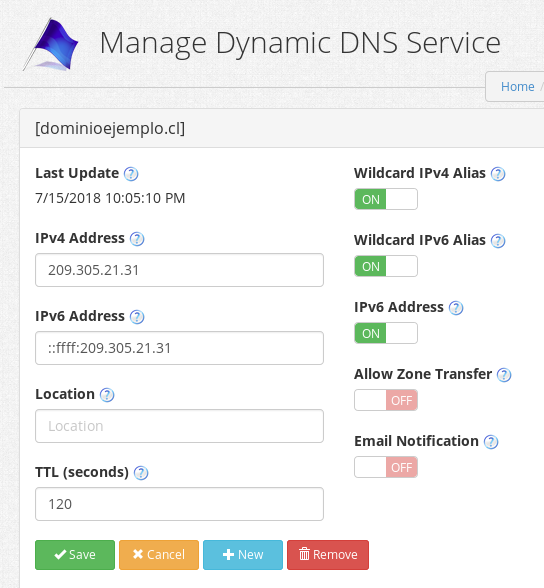 Una vez agregado el dominio en DDNS Services, la plataforma redirige a la Administrar servicio de DDNS. También se puede acceder con [engranecito] > DDNS Services > [dominio que acabas de agregar].